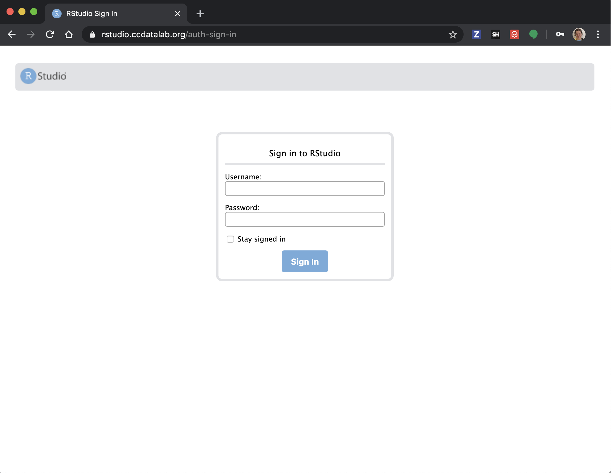Go to https://rstudio.ccdatalab.org and type in your username and temporary password, and click Sign in.