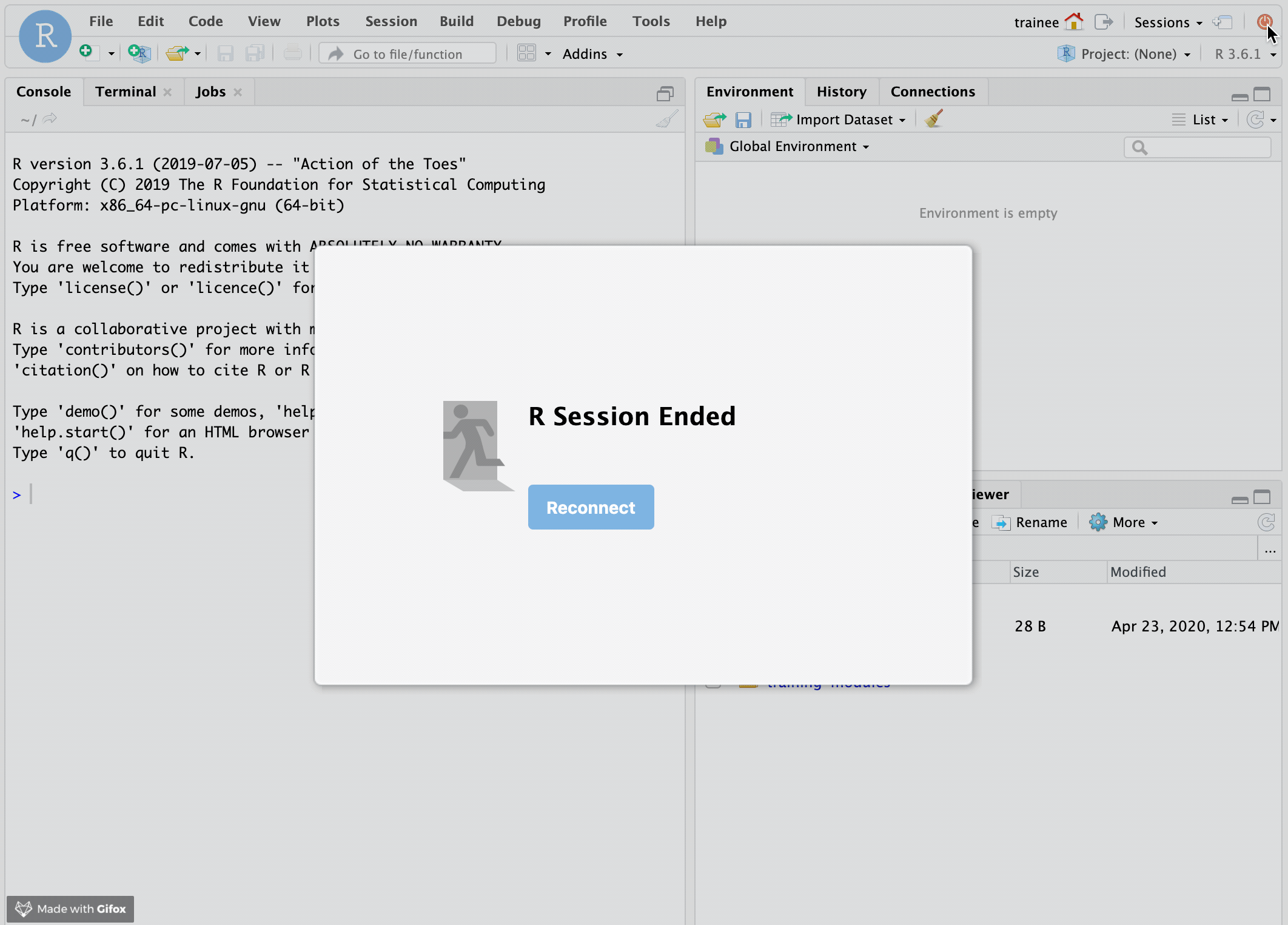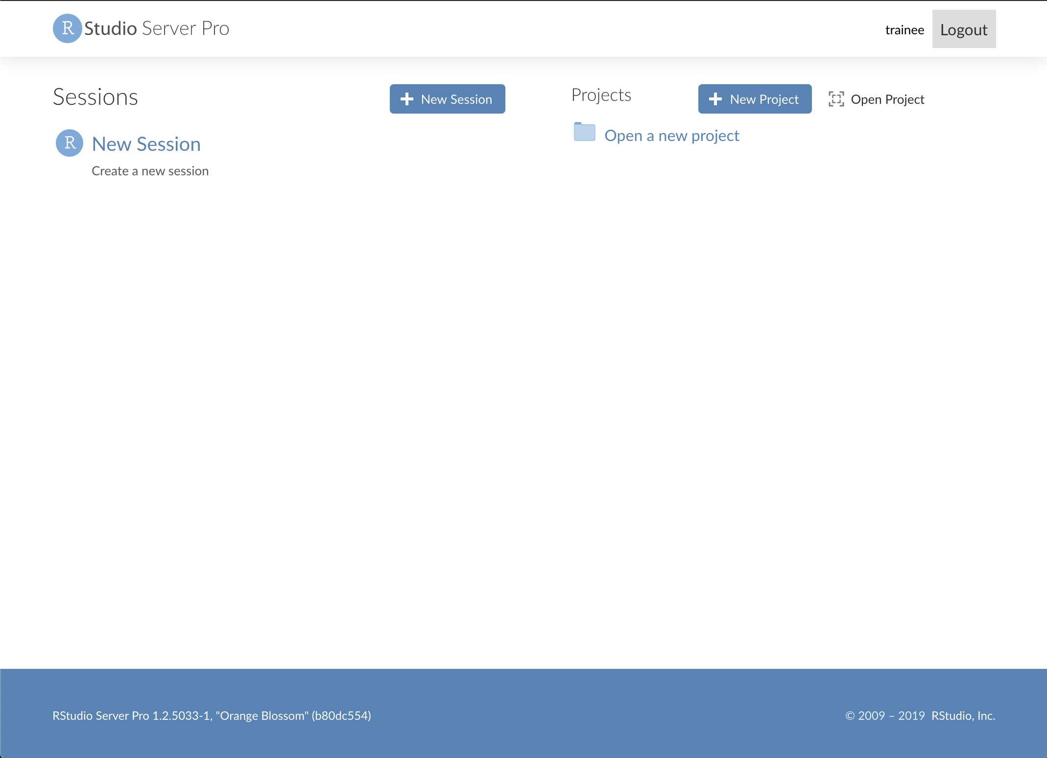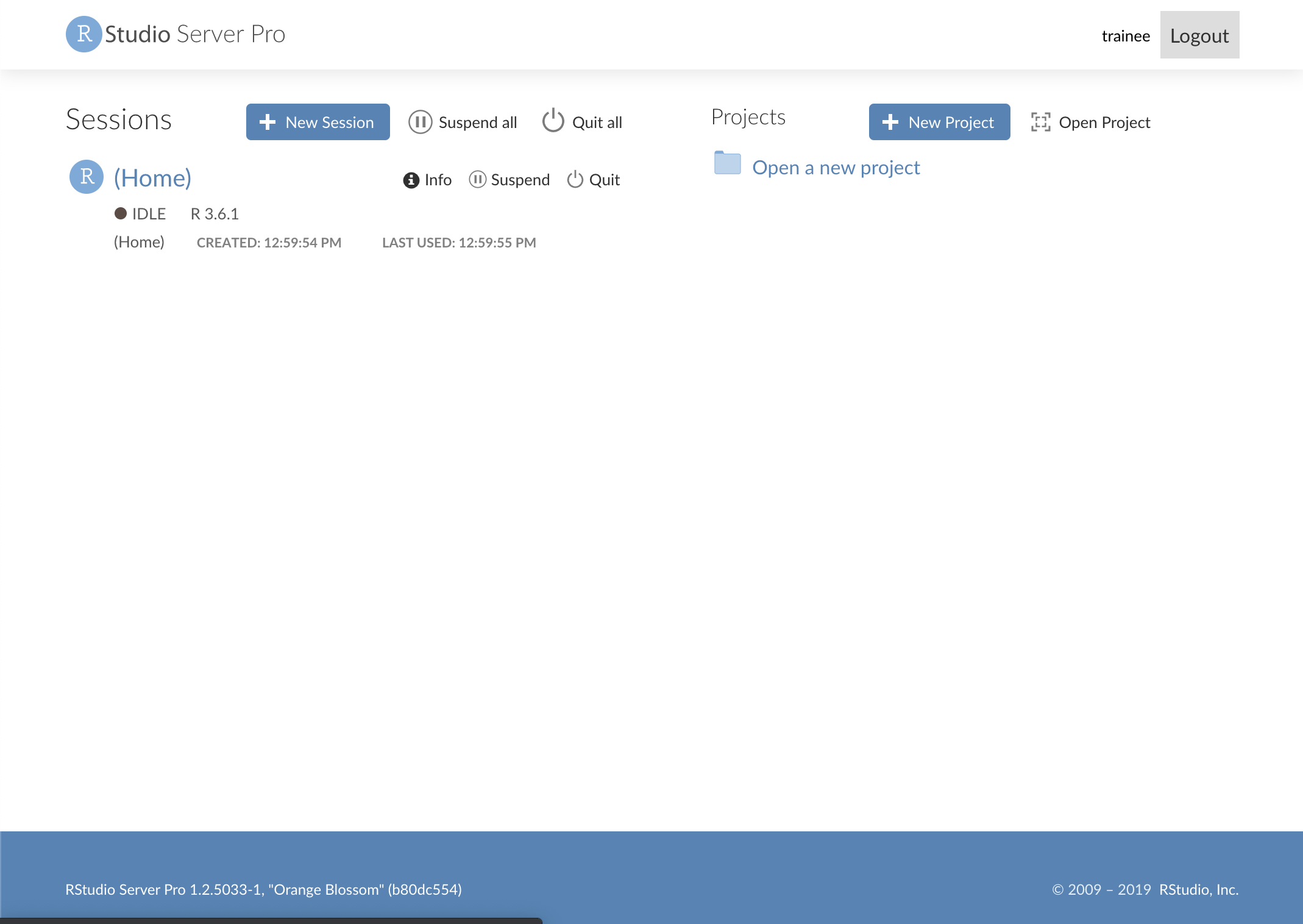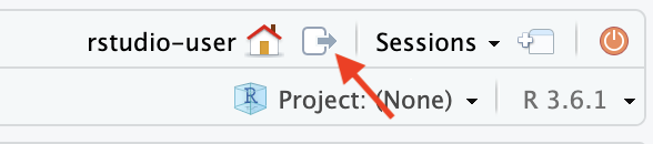 To avoid this problem to begin with, it helps to log out of RStudio Server before leaving for the day. You can log out either by clicking the “Sign Out” button in your session page:
