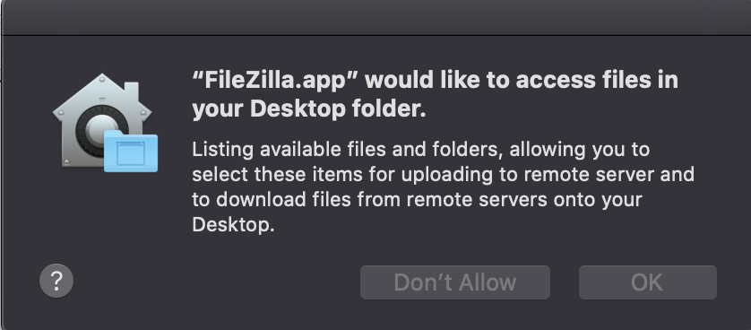 On a Mac, you will likely be asked to allow FileZilla to have access to your files.