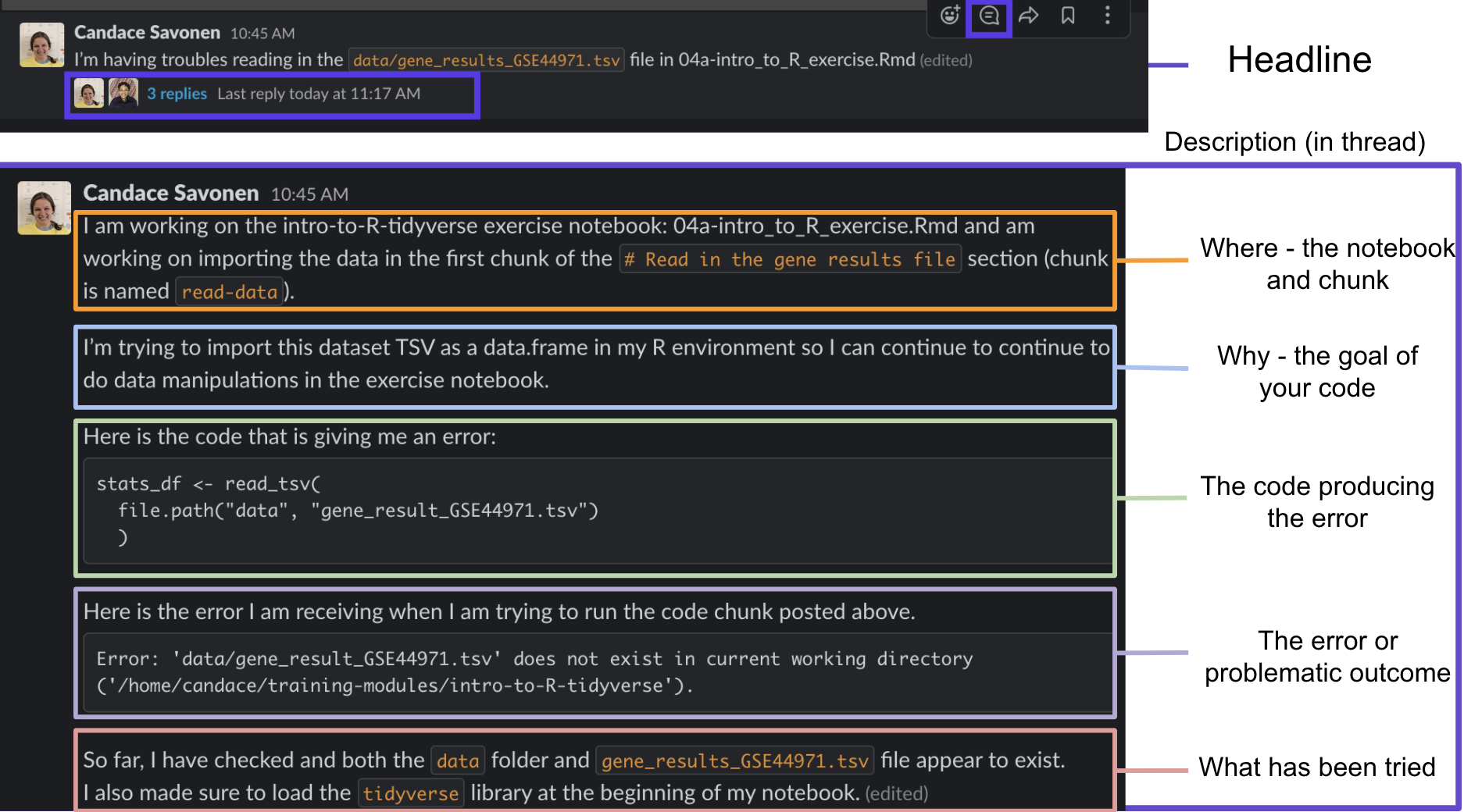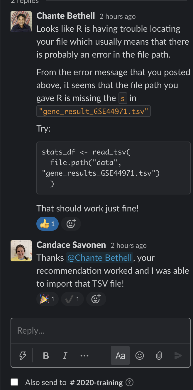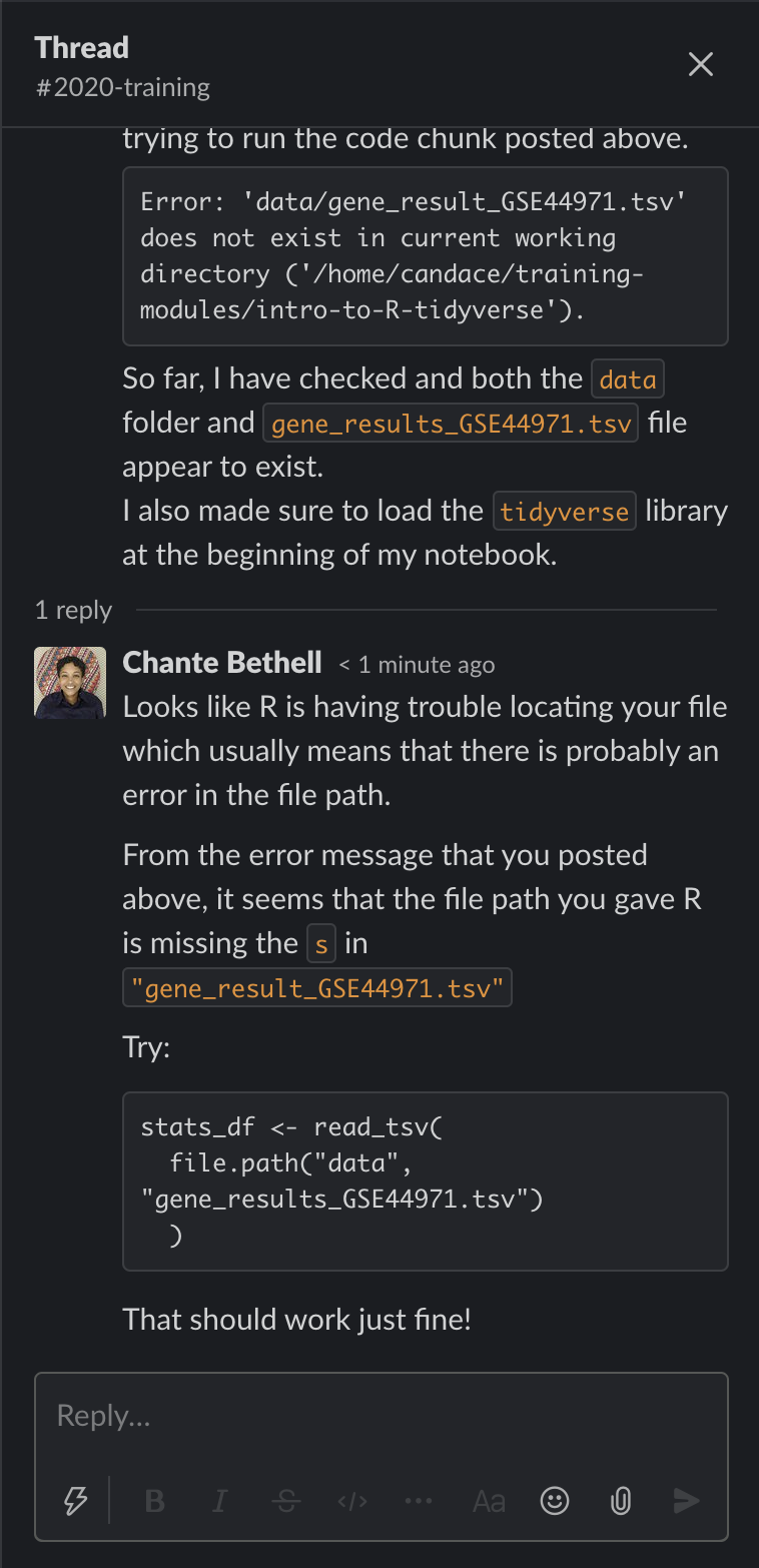 During and after the workshop, we encourage you to post your code error question to your Slack training channel.