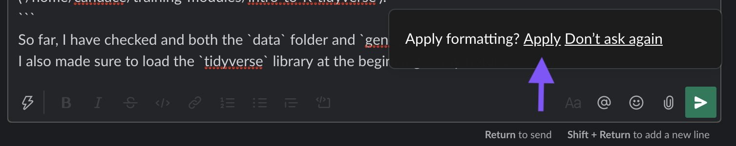 When you paste your text into Slack, it may ask if you’d like to Apply formatting. Click Apply.