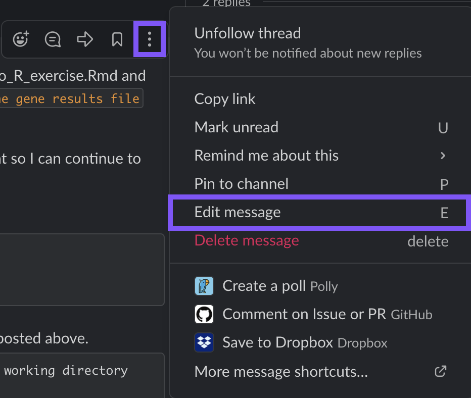 Slack Tip: if you see a mistake in your post you missed, you can click on the three dots in the corner of your Slack post and choose Edit message and fix the mistake: