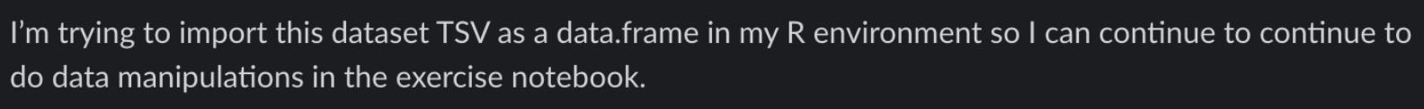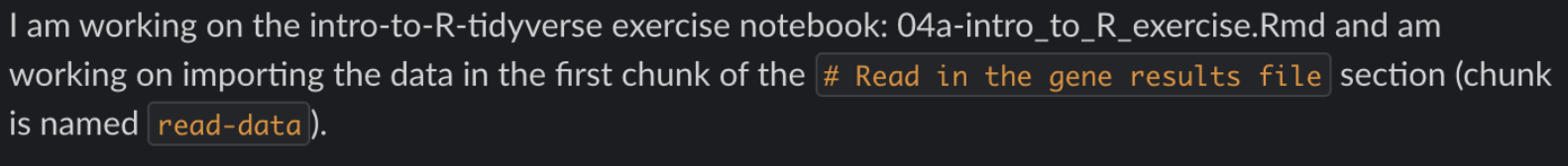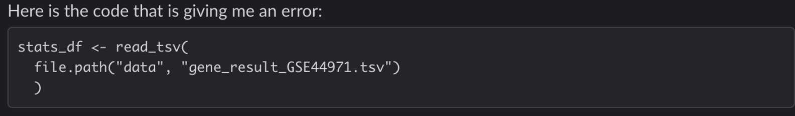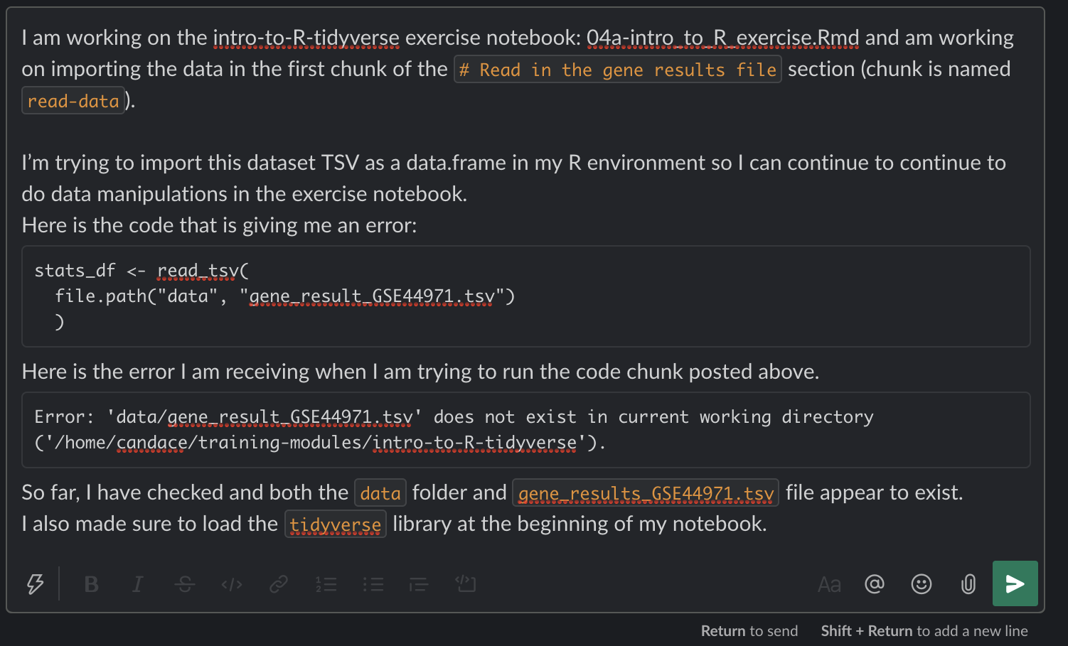 If you wrote out your error description in a text editor, it may have looked like this, where backticks we can turn into code chunks after we copy-paste it in Slack: