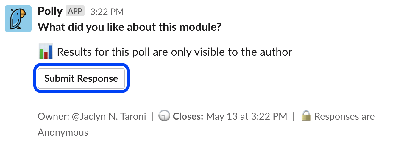 Use the Submit Response button in a Polly message to enter your feedback: